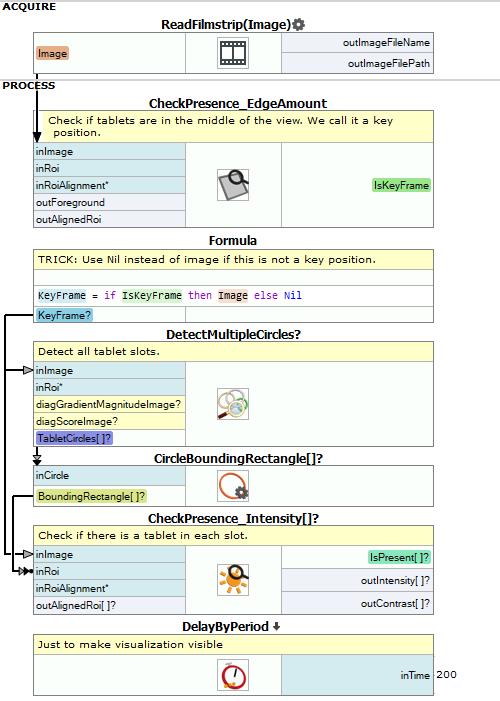 To detect damaged tablets it is recommended to consider using a DetectMultipleCircles filter together with a CheckPresence_Intensity filter to verify object presence by analyzing pixel intensities. To ensure that the inspection is performed once for an every batch of tablets, you can specify a Region Of Interest, where the inspection should be performed, as an input of CheckPresence_EdgeAmount filter.