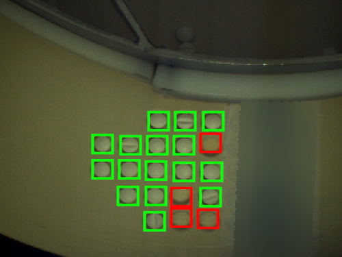 The aim of the program is to detect missing or damaged tablets on a conveyor belt.