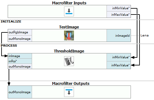 We have to have some Aurora Vision Studio project, which macrofilter we want to use in our application. For demonstrative purposes the project will be as simple as possible, just thresholding Lena's image with parameters provided in a Visual C# application's GUI. The macrofilter we would like to run in a C# application will be ThresholdLena (see: Creating Macrofilters). The whole macrofilter consists of two filters as in the image below: