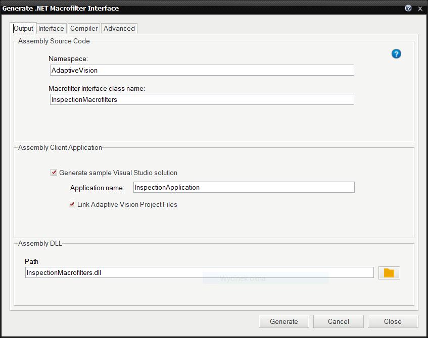 Macrofilters may be interfaced for use in such managed languages as C# or Visual Basic. Such interface is generated into a Dynamic Link Library (dll), which can be then referenced in a Visual C# project. To generate a dll library for the current Aurora Vision Studio project, fill in all necessary options in the .NET Macrofilter Interface Generator form that can be opened from File » Generate .NET Macrofilter Interface...