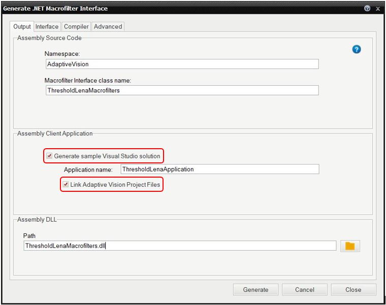 When ready, click Generate to generate an assembly, which will allow us to run the ThresholdLena macrofilter in a Visual C# application.