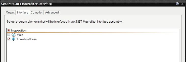 In the Interface page check the ThresholdLena to generate .NET Macrofilter Interface for the macrofilter. This macrofilter will be accessible as C# method later on.