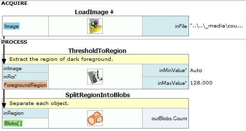 - To extract objects from the image add ThresholdToRegion filter to PROCESS section and set the value of inMaxValue to 128 and inMinBlobArea set to Auto.