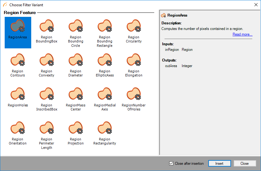 Aurora Vision Studio also provides separate filters that can be used to classify blobs which can be found in Toolbox, Region Analysis, Region Feature group.