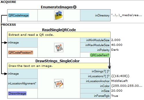 Add the ReadSingleQRCode filter to PROCESS section. Connect the outImage output of the EnumerateImages filter to the inImage input of the ReadSingleQRCode filter.