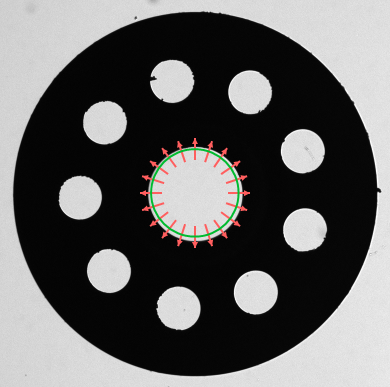 To detect the outer border of the part, add the other FitCircleToEdges filter. Set inScanCount and the inFittingField.Width size the same as in the previous filter. Create a circle that is a bit smaller than the perimeter of the object in the image. Change inEdgeScanParams.EdgeTransition to DarkToBright and inFittingMethod to GeometricLandau.