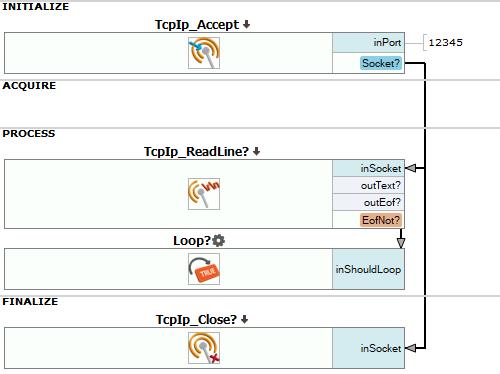 Turn on sections and add the TcpIp_Accept filter to the INITIALIZE section to accept the connection from the client. Rename the outSocket to Socket.