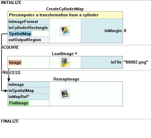 6. Add the RemapImage filter to the program, connect inImage with outImage of the LoadImage filter and inSpatialMap with outSpatialMap of the CreateCylinderMap.