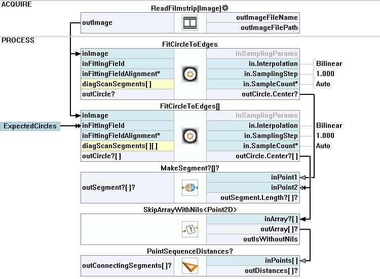 Add the PointSequenceDistances filter that measures the distances between consecutive points in the input array. The question mark in the name of the filter indicates that it will be executed conditionally. It means that the distance will not be measured if at least one circle is not detected.