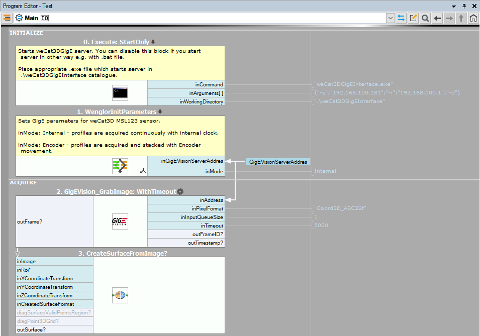 In INITIALIZE section Execute_StartOnly filter starts Wenglor WeCat3D server. Then WenglorInitParameters macrofilter sets appropriate parameters with GigEVision_SetParameter filters:
