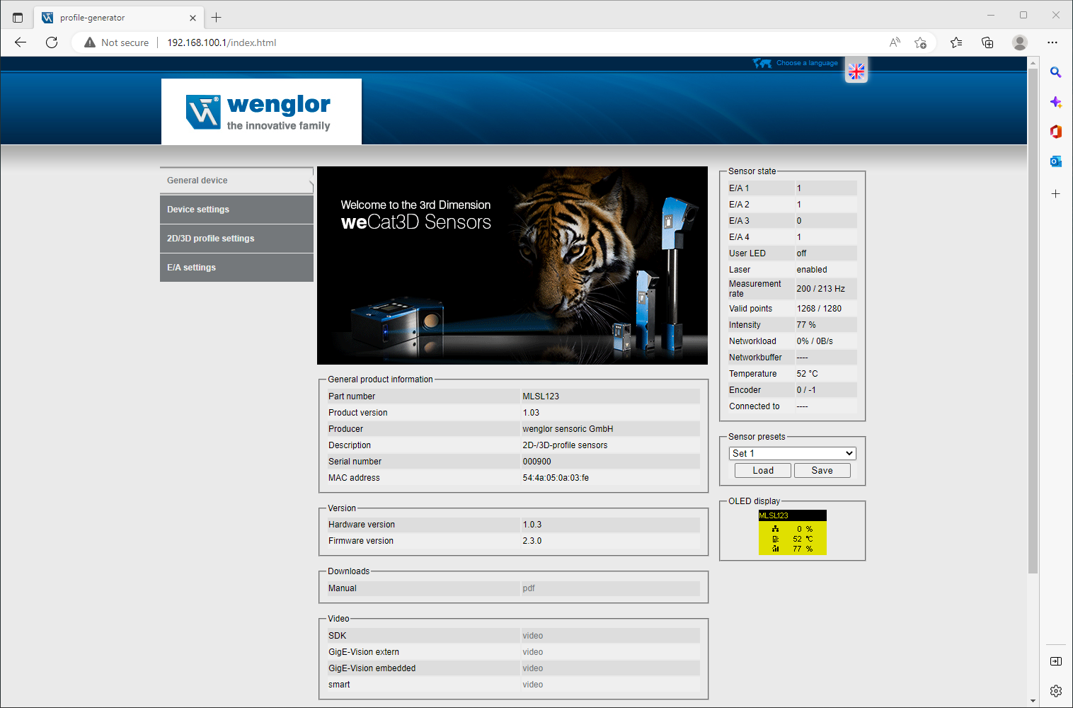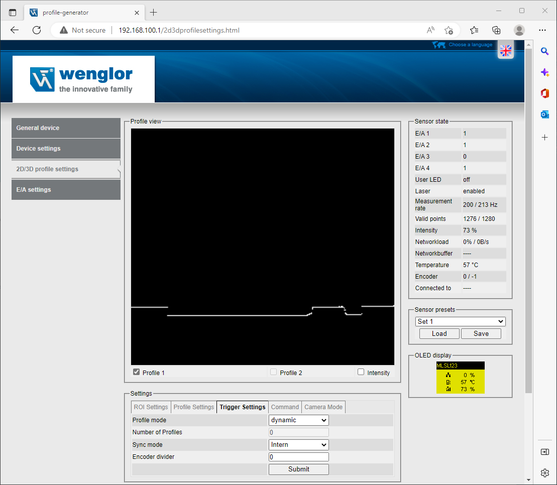 - The provided browser-based user interface allows you to configure the parameters of the Wenglor sensor. You can navigate to the 2D/3D profile settings tab to check if profile is acquired with Intern Sync mode: