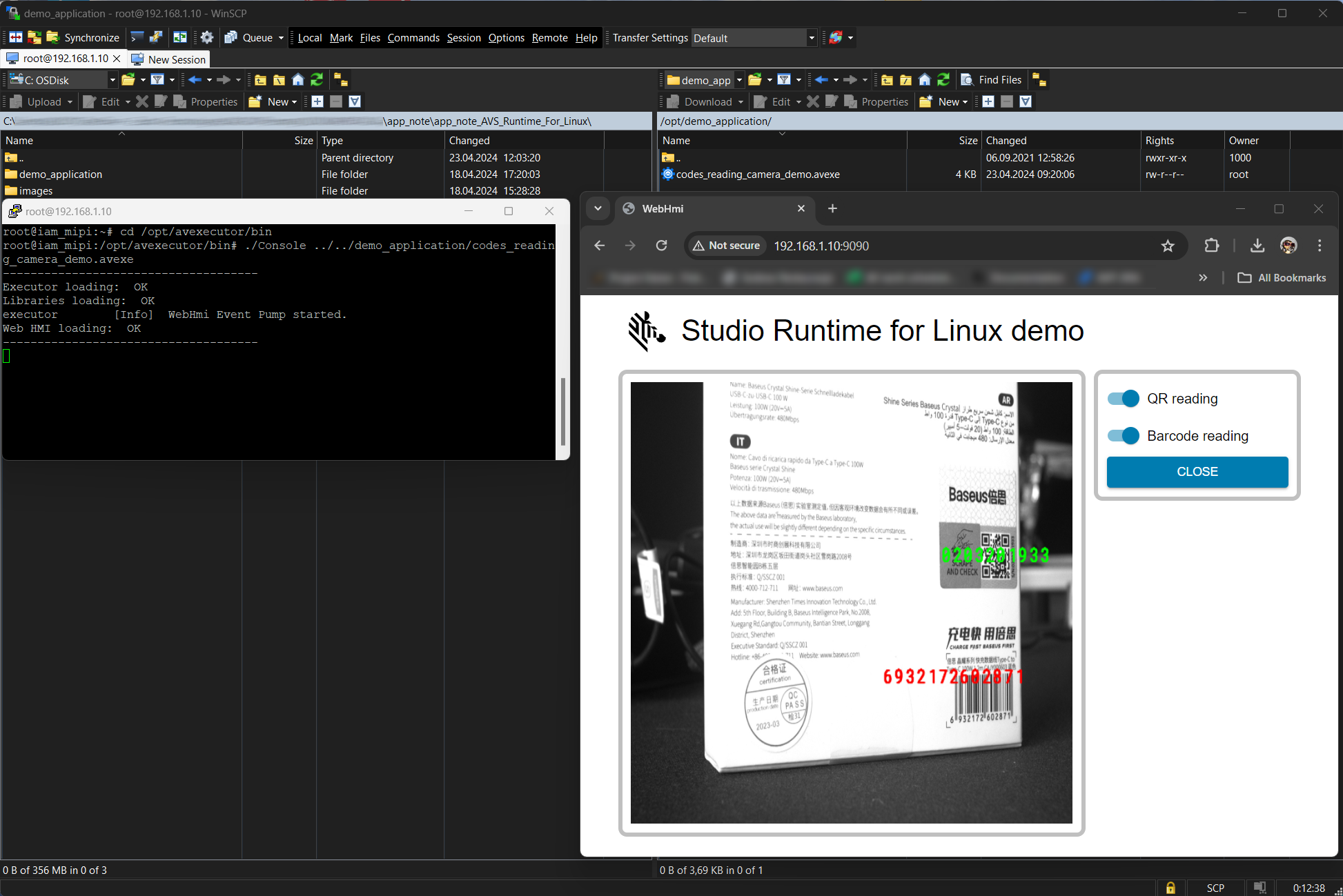 To manage and exchange files on the target system SSH connection is established. For convenience WinSCP and PuTTY are configured following the Getting started with the Windows Host System guide.