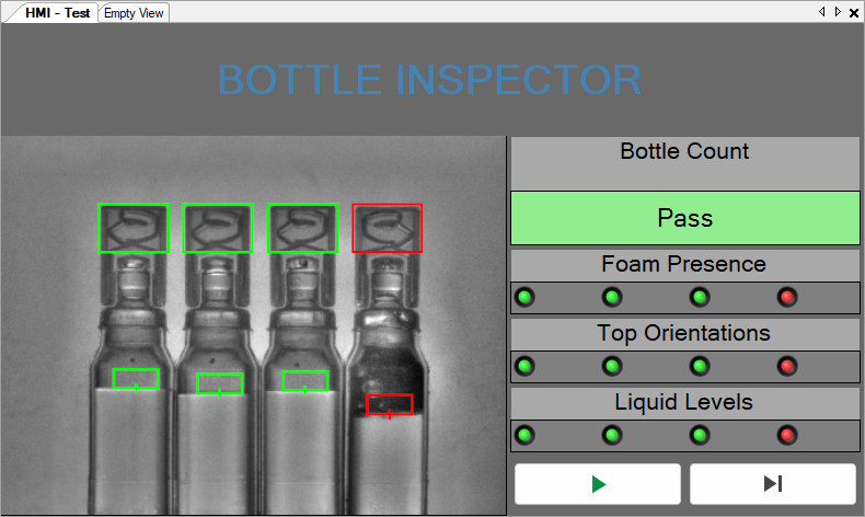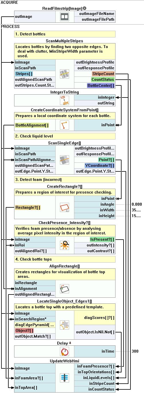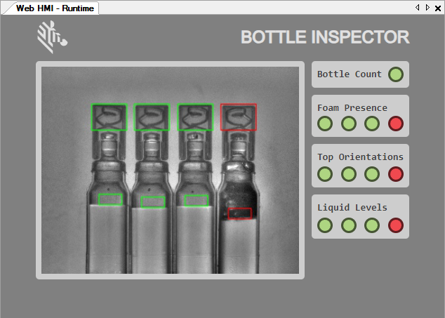 The task of this example is to check the number of bottles, their orientation, level of a liquid and presence of a foam.