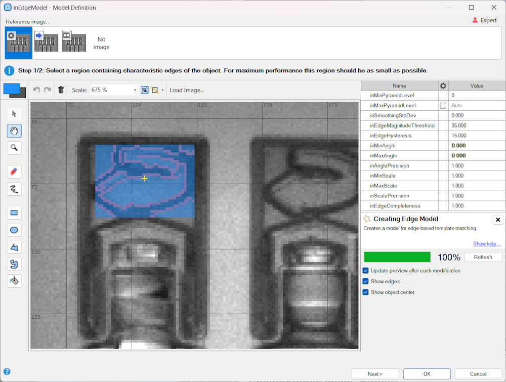 - The inEdgeThreshold parameter determines how strong the transition between pixels must be to be considered an edge. The inMinScore parameter determines the minimum score of a valid object occurrence. In this case we are only interested in finding the orientation of the cap, so the minimum score must be relatively low.