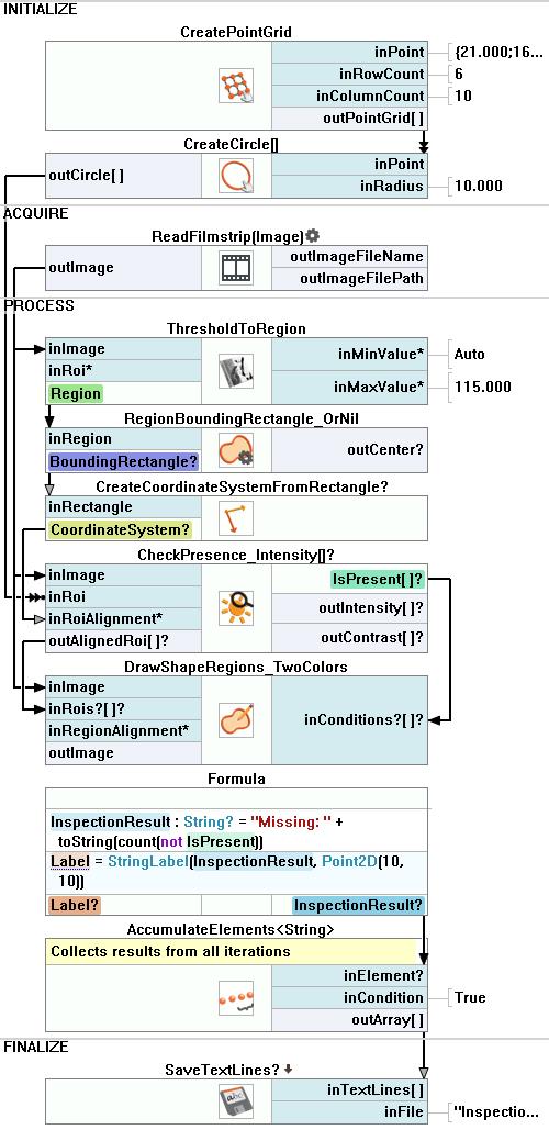 Inspection of the buttons presence can be performed by the CheckPresence_Intensity filter. Add this filter to PROCESS section and connect its inputs: