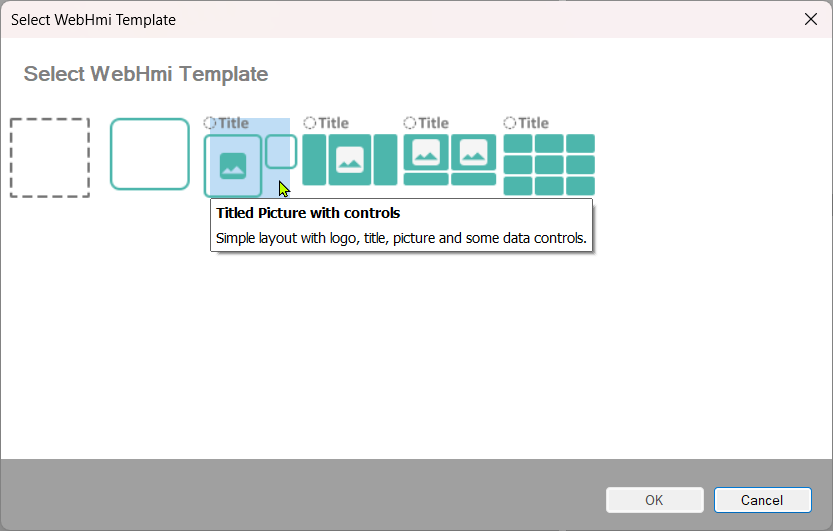 To add a WebHMI subsystem, choose Edit » Add Web HMI... and select a WebHMI template that fits the target layout. The template is just a starting point that can be freely modified. Here, the Titled Picture with controls template was used: