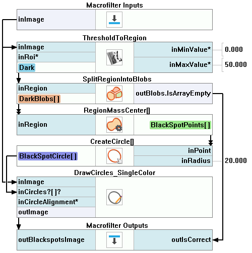 As spots are much darker than the background, add the ThresholdToRegion filter. Set the inMinValue to 0 and the inMaxValue to 50.