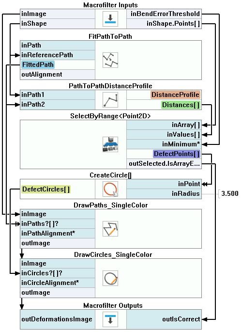 The task of macrofilters FindCapsuleRegion and FindCapsuleShape was to extract the contour of the capsule. Next, create a Step macrofilter DetectDeformations. In this filter, you will be coalculating the distance between the outShapeOrNothing path and the model path. If the distance is longer than specified, the capsule is considered damaged.