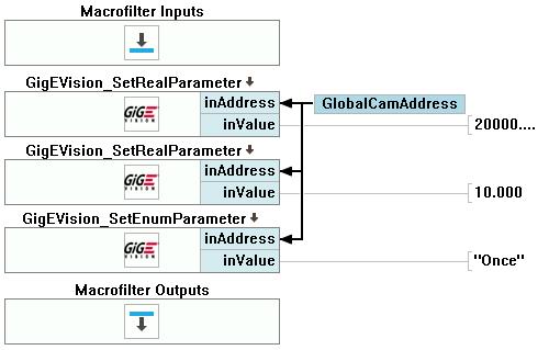 - In the InitializeParameters marcrofilter adjust ExposureTime, Gain and WhiteBalance with GigEVision_SetRealParameter and GigEVision_SetEnumParameter filters.