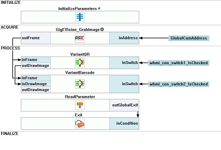 The task of this example is to prepare application which is based on WebHmi creation. Application initialize camera parameters, grabs image using GigE Vision filters, reads codes and displays the result of the inspection on the WebHmi.