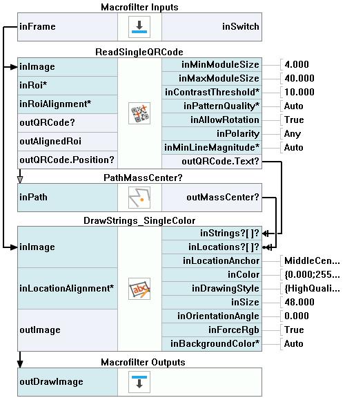 - In the VariantQR use ReadSingleQRCode. Gain point of mass for path outline with PathMassCenter. Draw result string with DrawStrings_SingleColor filter, use the path mass center as location.