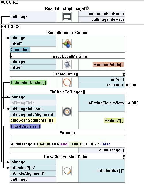 - The next step is to fit the circles to the original image. You can do it with the FitCircleToRidges filter. As the inImage use the original image. Connect the outCircle positions to the inFittingField.Axis. Change of the following parameters will be required: