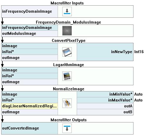 - Inside the ConvertForDisplay add the FrequencyDomain_ModulusImage to computes the modulus of each frequency domain image pixel. Connect it with the step inFrequencyDomainImage input.
