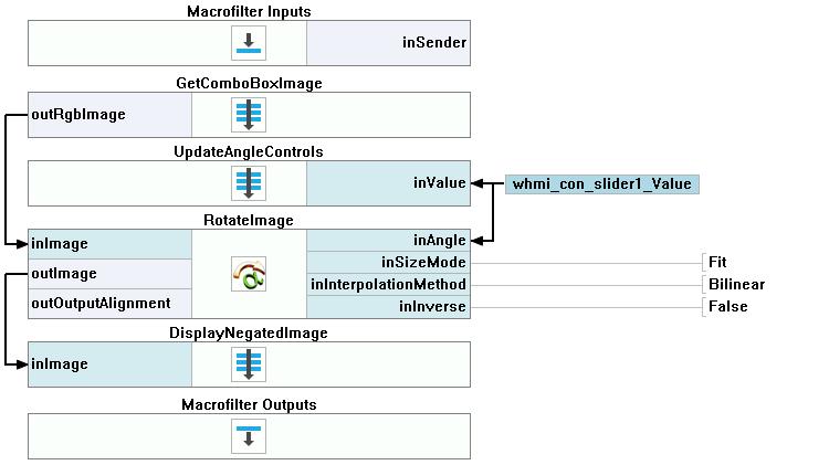 - In SliderRotateImage event handler connect UpdateAngleControls filter input inValue and RotateImage filter input inAngle to slider1 control outValue output.