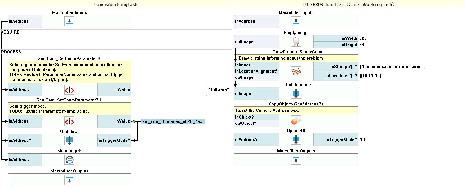 Inside the CameraWorkingTask connect the macrofilter input with the 2 GenICam_SetEnumParameter filters' inputs, the UpdateUi macrofilter input and the UpdateImage macrofilter input.