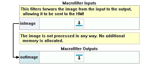Inside the ForwardImage macrofilter darg the Image input to the Macrofilter outputs section. Thank to that the image is forwarded from the input to the output, allowing it to be sent to the HMI. The image is not processed in any way. No additional memory is allocated.