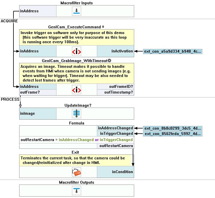 Inside the MainLoop macrofilter connect the macrofilter input to the GenICam_ExecuteCommand and the GenICam_GrabImage_WithTimeout inputs.