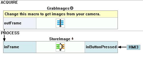 The task of this application is to grab and save an image in certain time, not in every iteration. Therefore ImpulseButton available in the Controls category can be used as a trigger. Connect its outValue output to the StoreImage's macrofilter forking port.
