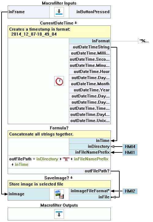 - Add the Formula's input inDateAndTime of type String and connect it with the outDateTimeString. Then add another inputs of type String: inDirectory and inFileNamePrefix. These inputs will be connected to specific HMI controls, since user has to be able to set a destination directory and a name prefix of file.