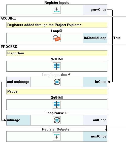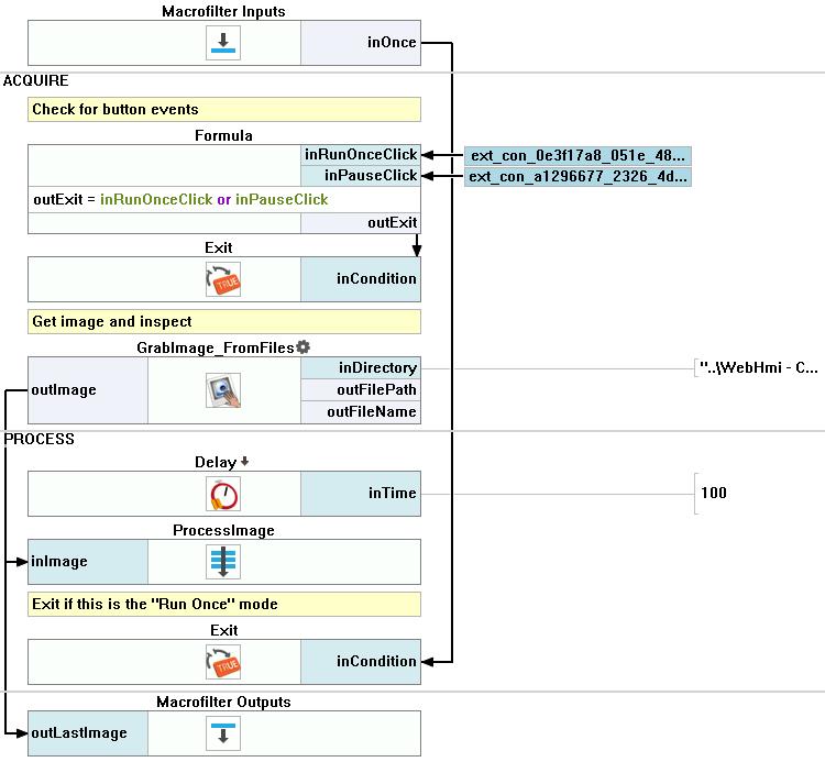 Go to the LoopInspection macrofilter. Connect the formula inputs to the Value outputs of the Run Once and the Pause HMI buttons.
