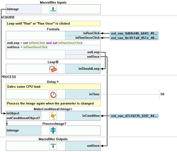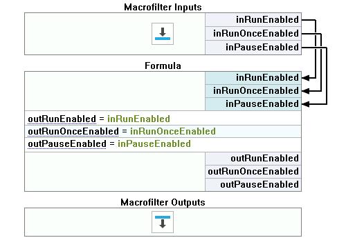 Go to the LoopPause macrofilter. Connect the formula inputs to the Value outputs of the Run and the Run Once HMI buttons.
