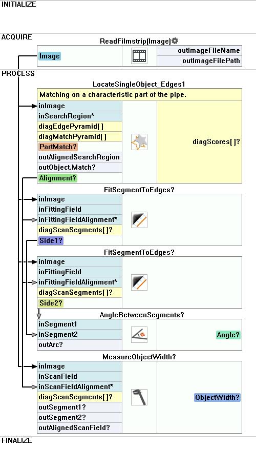 Next, a location of pipe should be found. To perform this task add the LocateSingleObject_Edges1 filter. Next connect output image from the ReadFilmstrip.