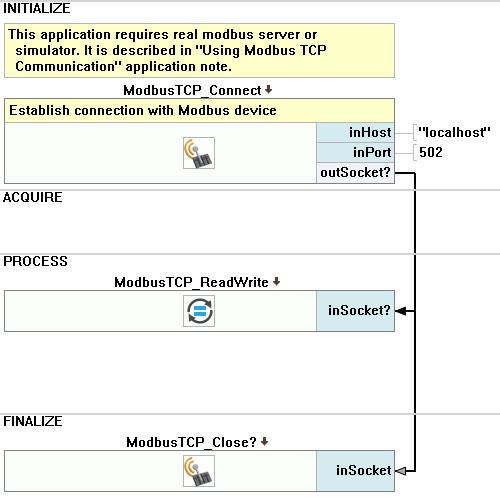 The application shows how to configure a simple Modbus TCP connection. It requires a real modbus server or simulator. It is described in the "Using Modbus TCP Communication" application note.