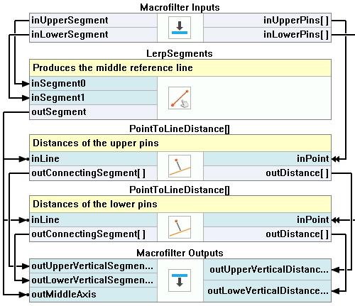 The program calculates distances between consecutive points of one row. Now we need to measure the distance to the center. To find the centerline add the LerpSegments filter. Set its inIgnoreOrientation to True. Connect the outConnectingSegments of both the InspectRowOfPins macrofilters to its inSegment0 and inSegment1 inputs.