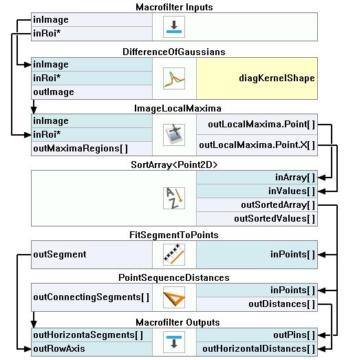 Add the PointToLineDistance filter. Connect the outSortedArray output of one of the InspectRowOfPins macrofilter to the inPoint input. Then connect the outSegment to the inLine.