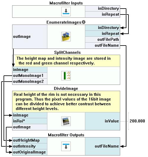 Real height of the rim is not necessary in this program. Thus the pixel values of the 16bit image can be divided to achieve better contrast between different height levels. Add the DivideImage filter. Connect its inImage input to the outMonoImage1 out of the previous filter. Set the inValue to 200.