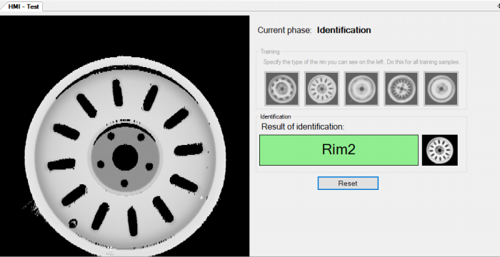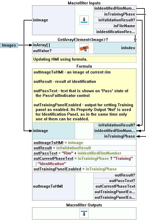 outTrainingPanelEnabled = inTrainingPhase - The outImageToHMI is an image of a current rim, the outResult is the result of the identification, the outPassText is the text that is shown on 'Pass' state of the PassFailIndicator HMI control, the outTrainingPanelEnabled is the output for setting the Training panel as enabled. Its Property Output Not is used for the Identification Panel, as in the same time only one of them can be enabled.