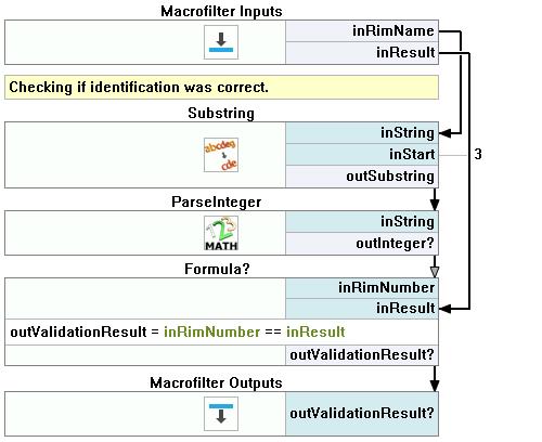 - Compare the predicted model with the one form the Substring. Add the formula. Drag the ParseInteger output and name the new input inRimNumber, and the inResult from the Macrofilter Inputs, leave the default name. >Formula: outValidationResult = inRimNumber == inResult*