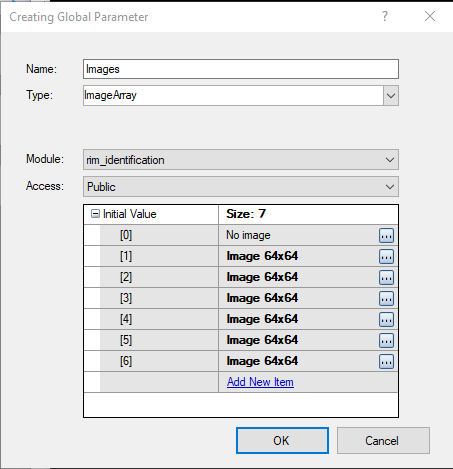 In the Project Explorer window cerate a new Global Parameter of the ImageArray type and name it Images. Set the initial value as shown on the picture below: