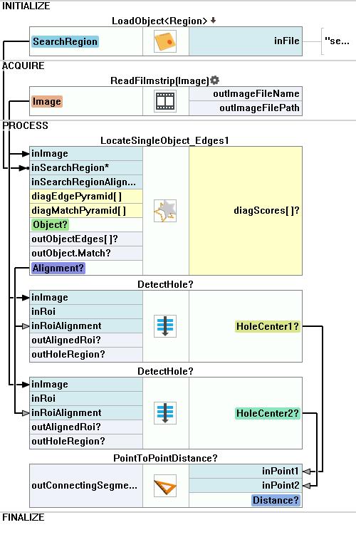 Add the PointToPointDistance filter and connect its inputs with outputs of both instances of the DetectHole macrofilter. The outDistance output is desired result of this program.