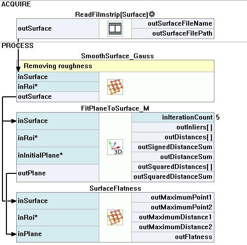 To remove roughness from the scanned data use the SmoothSurface_Gauss filter. Find the plane related to the input surface with the FitPlaneToSurface_M and measure the flatness with the SurfaceFlatness filter.