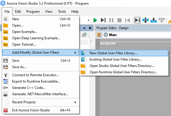 Alternatively, it is possible to create a new directory for a global user filter library:Documents\Aurora Vision Studio 5.4 Runtime\Filters\Deps_x64