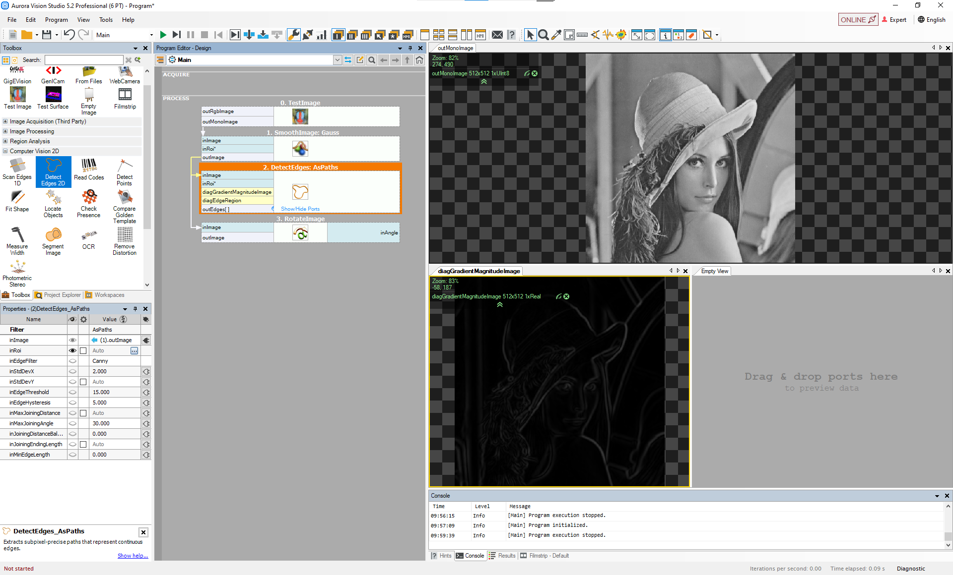One of the best ways to learn Aurora Vision Studio quickly is to study the example projects that come with the application. The File » Open Example... command is a shortcut to the location they are stored in. The list of available projects is also available in the Program Examples section.