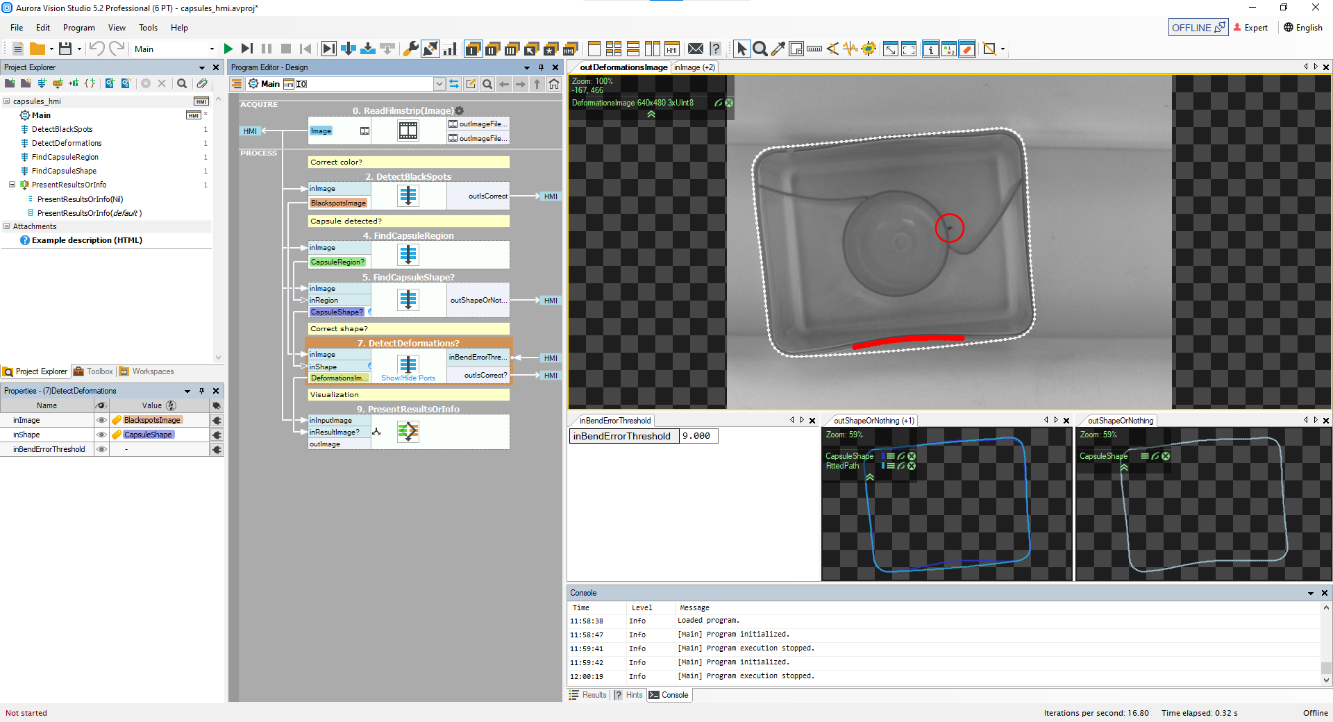 Aurora Vision Studio Professional is a dataflow-based visual programming environment designed for machine vision engineers. Together with its comprehensive library of highly optimized image analysis filters (tools) it allows the user to create both typical and highly customized algorithms for industrial vision systems. Furthermore, it is a complete solution as it also makes it possible to create custom graphical user interfaces (HMI).