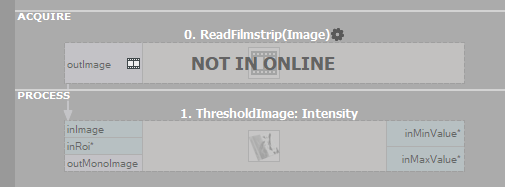 In Offline Mode, the Online-Only filters are marked OFFLINE and are skipped during the execution in the Offline Mode. However, it is possible to make the Online-Only filters execute in the Offline Mode. It is done by binding at least one of their outputs to the Filmstrip channel. The only requirement is that the filter must be inserted into the ACQUIRE section of any Worker Task Macrofilter. The output can then be bound either through the Bind with Filmstrip command in the output's context menu or by dragging the channel from the Filmstrip control onto the filter output.