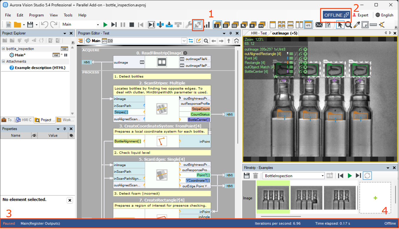 Aurora Vision Studio Main Window with marked the Offline mode and execution indicators.